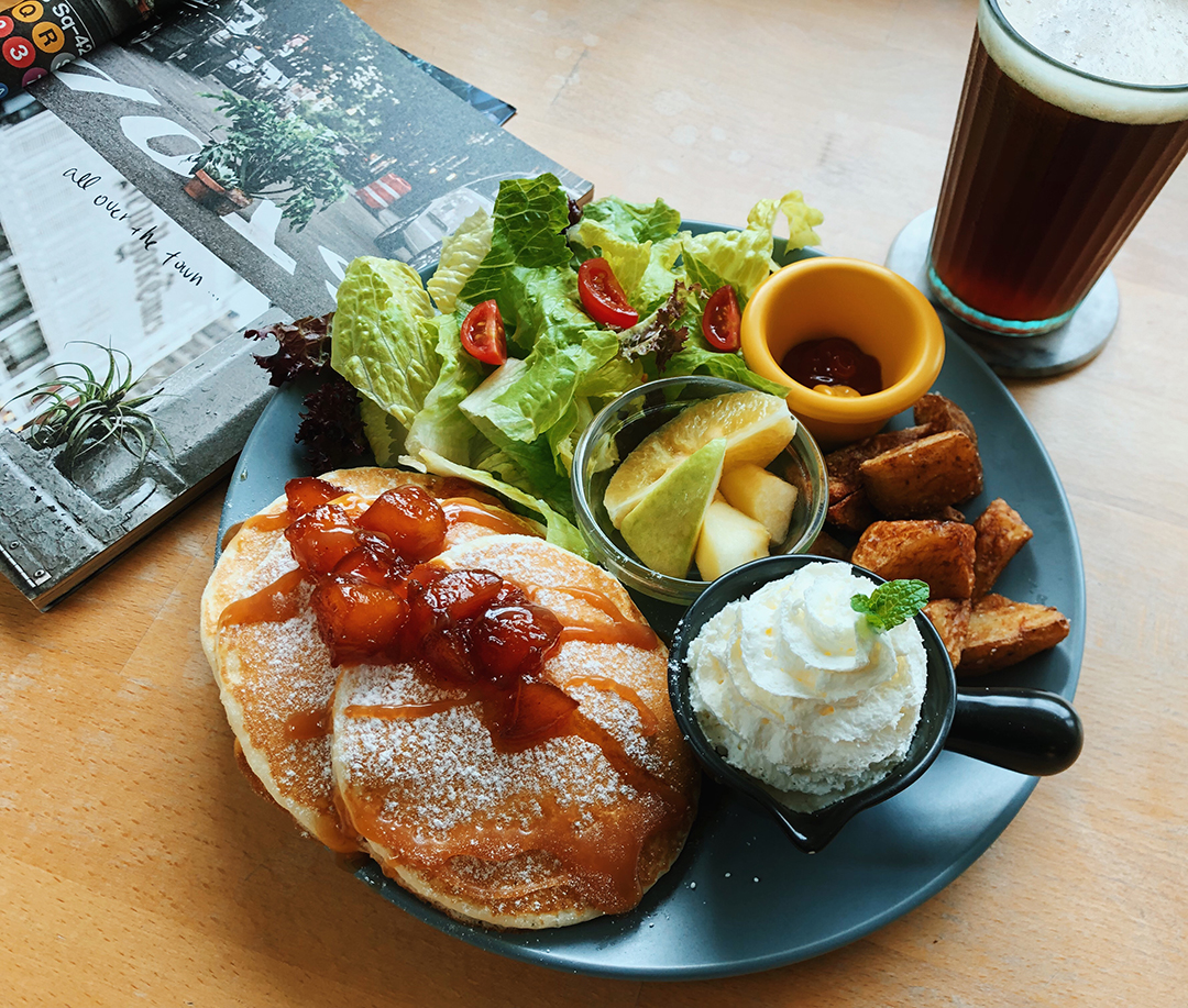店家自己炒的焦糖蘋果醬,熬煮的時候加了新鮮柳橙汁,帶出柑橘香與酸味,再加上一點現磨新鮮荳蔻,讓荳蔻粉的特殊香味提升到另一個層次,將焦糖蘋果漿淋在鬆軟的鬆餅上,酸酸甜甜的口感中還能吃到混有烤過的堅果粒,這樣的用心程度讓人特別滿足。 (還可以搭配滑順的鮮奶油一起入口,又多了一種選擇!)