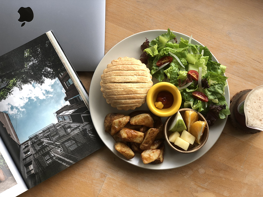 鹹派裡面有上下兩層舖層,上層是洋蔥咖哩餡,下舖是厚厚的馬鈴薯泥,烤熱時外皮酥脆、內餡香嫩,咖哩味道讓人想一口接著一口,馬鈴薯泥中和了咖哩餡的濃郁,店裡的料理都附有早上採買製作的蔬菜沙拉和小盤水果,絕對不會有口味單調的問題出現!