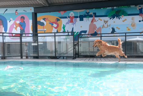 餐廳的旁邊就是泳池畔,放眼水質清澈,銅銀離子消毒完全為毛孩的衛生安全把關,也無消毒水的刺鼻氣味,店長特別強調「毛孩們游泳時最可愛的地方就是划水的腳丫子」,所以泳池的一側特別設計成透明的全見牆,讓家長們可以隨時紀錄孩子們落水前後的萌樣~